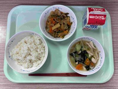 〈 麦ごはん 牛乳 チンジャオロース 五目豆腐スープ 〉