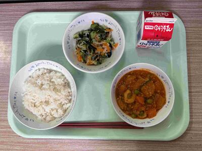 〈 麦ごはん 牛乳 かぼちゃのミートソース煮 ちりめんの酢の物 〉