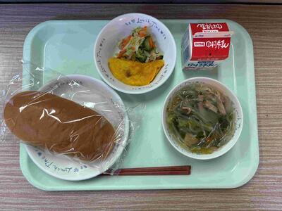 < ミルクパン 牛乳 トマトミートオムレツ 添え野菜 春雨スープ >