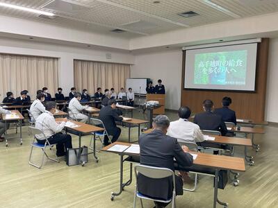 先日実施した3年生の学年発表において選ばれた6グループが、12月5日(金)に高千穂町役場にて町長、教育長、各課課長へ、研究の成果を発表しました。専門的な質問を受けながらも、たくさんのお褒めのお言葉をいただきました。今回の代表に限らず3年生のどの発表においても、高千穂町をさらに良い町にしていくための提案を真剣に考え、調べ、実践し、発表しました。継続できる課題は、来年度、2年生が受け継ぐことでさらに深まります。町長、教育長はじめ各課課長の皆様、議会前に大変お忙しいところにご参加いただきありがとうございました。