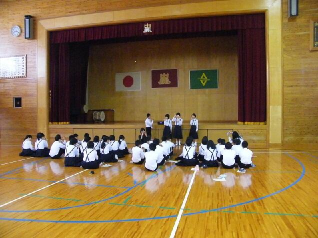 2年生は修学旅行の交流学習で行う発表のリハーサルを行いました。発表は、プレゼンテーションによる岩戸中学校の紹介、棒術・神楽の披露です。毎日夜まで練習しているだけあってとても上手でした。みんな顔つきが真剣です。