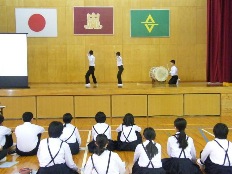 13日の午後は、全校生徒で高千穂中学校へバスで行き、高千穂中生と一緒に鑑賞教室に参加しました。