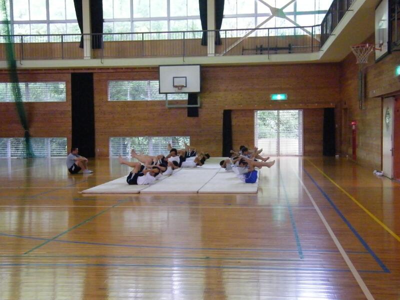 事前指導と同時刻に、1・3年生の生徒は体育の授業を合同で行いました。男子生徒は組み体操の練習に向けて、筋トレを行っているようです。まずは体作りから!3年生が大きな声を出して、1年生をリードしていました。たくましい3年生です。