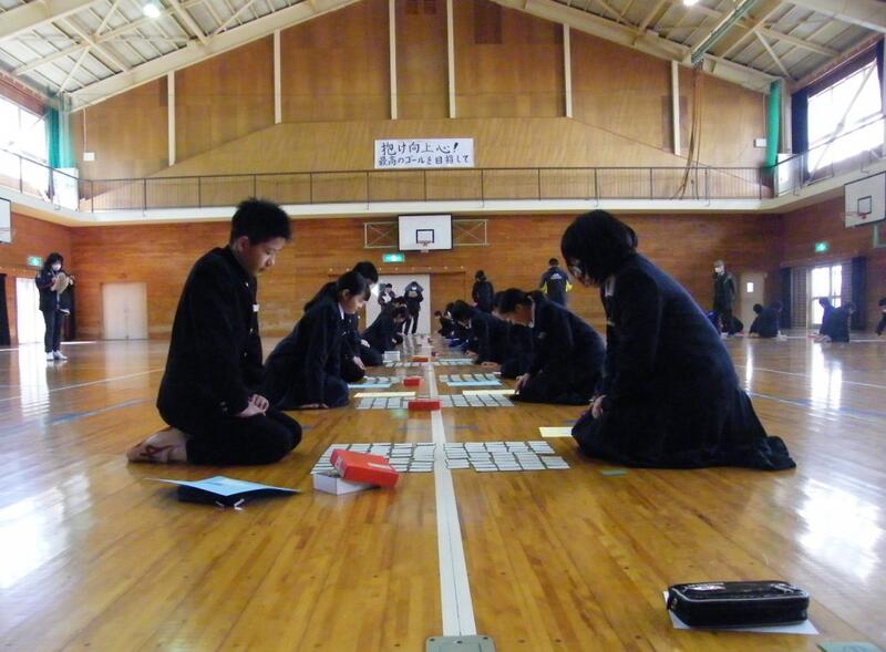 岩戸中学校の伝統行事であります百人一首大会を全校生徒で行いました。先生が読み手となり、どの場所でも熱い戦いがくり広げられました。