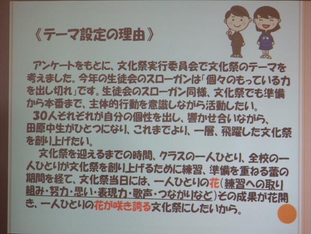 本日の全校集会は、文化祭実行委員のあいさつと文化祭スローガンの発表でした。スローガンが、どのような経緯で決定したのか。また、スローガンに込められた思いなどが文化祭実行委員から説明がありました。