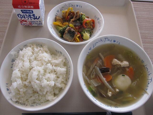 今日の給食は、たまごスープに魚のレモン煮でした。おいしくいただきました。