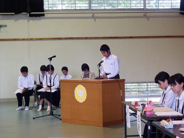 本日の5時間目,全校生徒が参加しての英語科暗唱コンテストが行われました。生徒は1ヵ月ほどの練習期間を経て,本番に臨みました。1年生は,学習していない単語も含まれていましたが,声の大きさや話すスピードなどに気を配り,身振り手振りを加えながら堂々と発表することができました。ALTのトリシア先生にも審査に加わってもらい,成績上位の生徒は,西臼杵郡英語暗唱・弁論大会に出場することになります。なお,生徒全員の発表の様子は学校アルバムにあります。