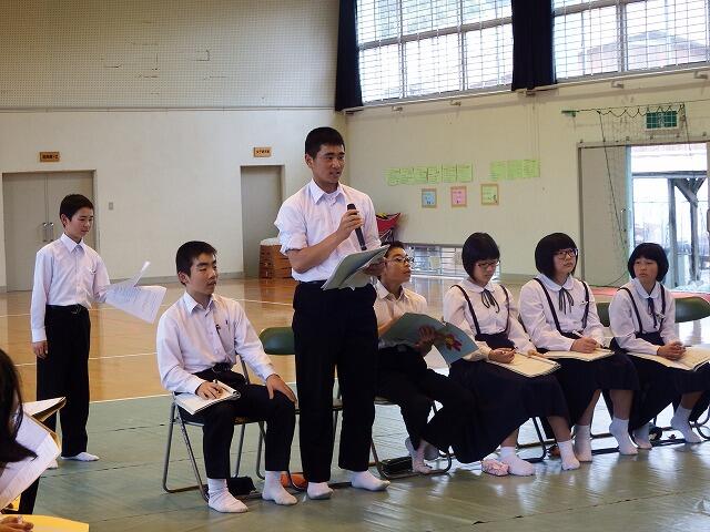 本日の全校集会は,明日から始まる第66回西臼杵地区中学校総合体育大会の選手推戴式でした。各部のキャプテンから意気込みと支えてくださった方々への感謝が述べられ,最後の大会に臨む3年生の思いが伝わってきました。みなさんの健闘を祈ります。