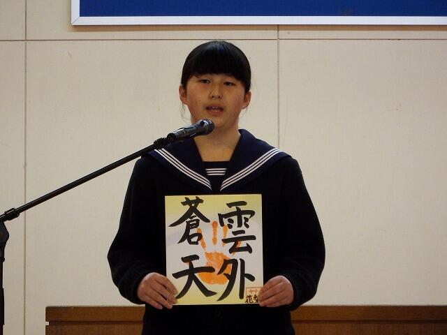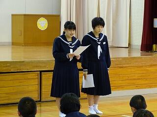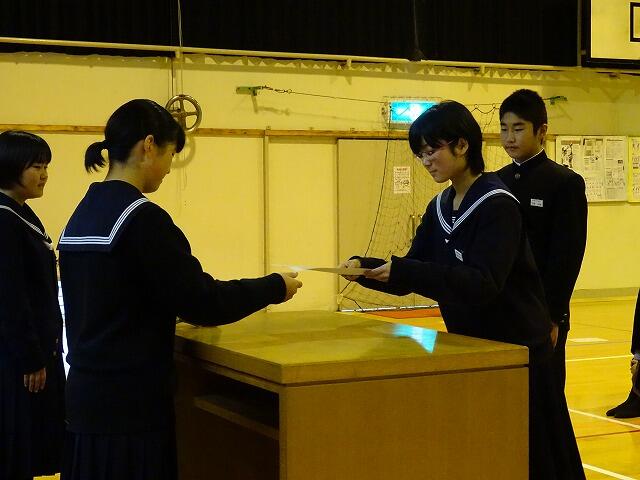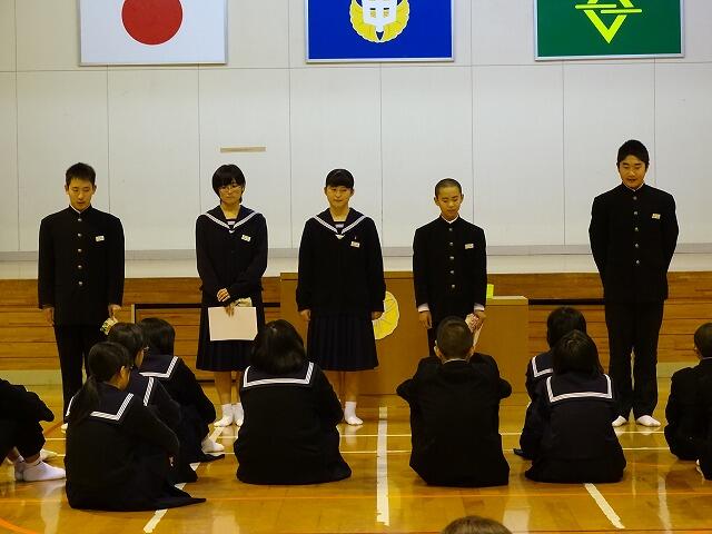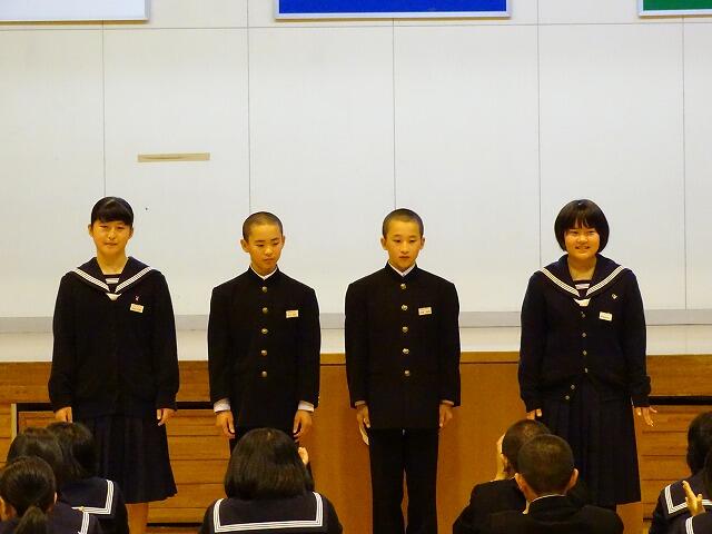 本日の「たばるっこタイム」は、新生徒会役員任命式と旧生徒会役員の退任式でした。新生徒会の1・2年生は、それぞれの抱負を力強く述べてくれました。また、様々な行事を成功へと導いてくれた旧生徒会の3年生は、これまでの協力に対する感謝の言葉や思い出などを述べてくれました。
