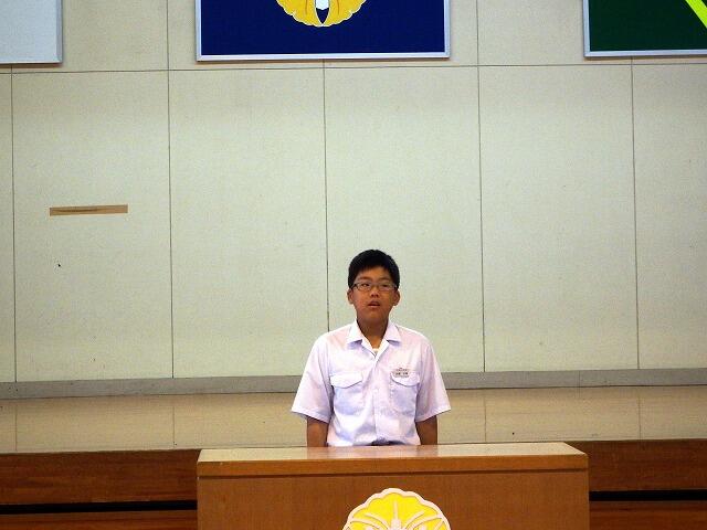 本日は、台風11号接近のため、明日(17日)に予定していた終業式を1日繰り上げて行いました。各学年と生徒会の代表生徒4名が、1学期を振り返っての反省を述べました。