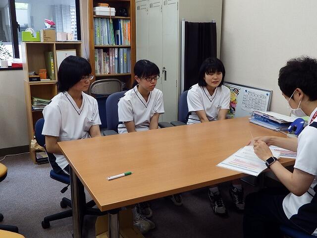 3名の卒業生に来ていただき、「卒業生の声を聞く会」を開催しました。3人それぞれの高校選択・学科選択、どんなことを学んでいるのか、これからの進路など、興味深い話を聞くことができました。3人の先輩方の貴重なお話をもとに、自分自身の進路について考えるきっかけとなる、充実した時間になりました。