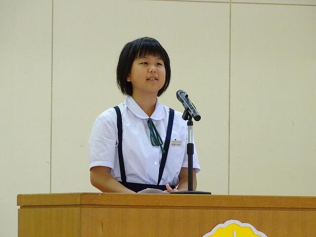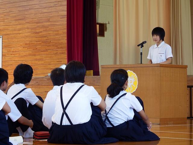 本日は、台風11号接近のため、明日(17日)に予定していた終業式を1日繰り上げて行いました。各学年と生徒会の代表生徒4名が、1学期を振り返っての反省を述べました。
