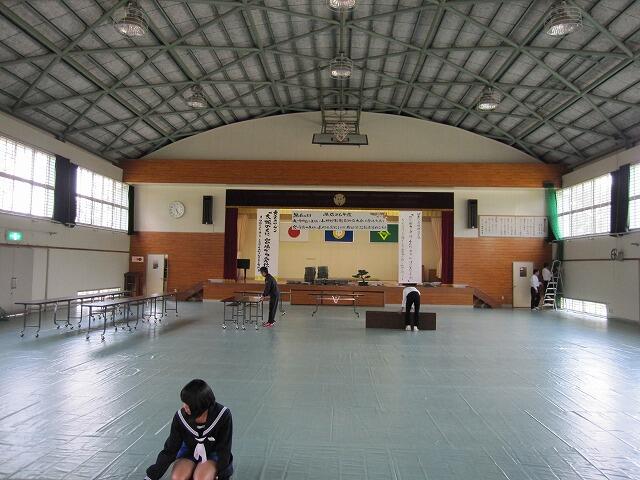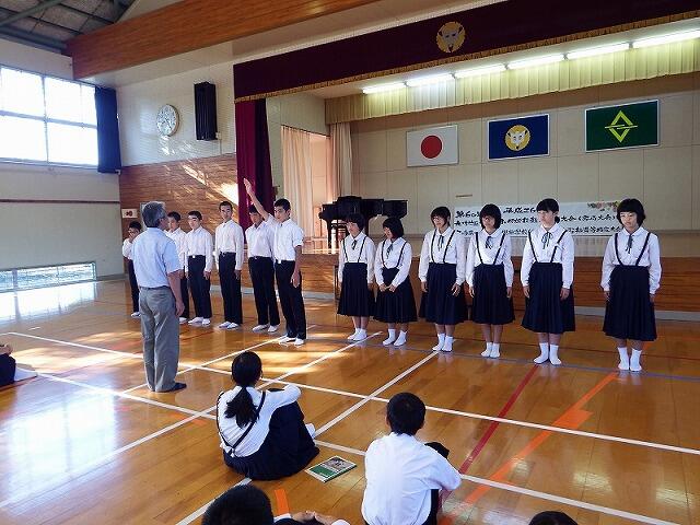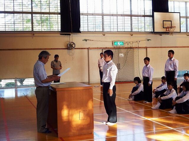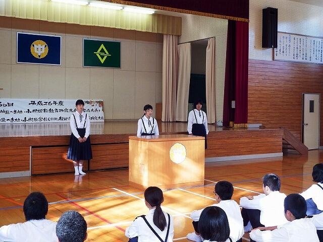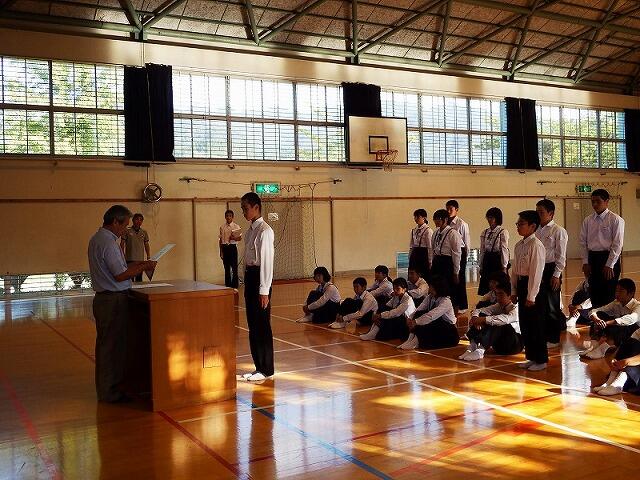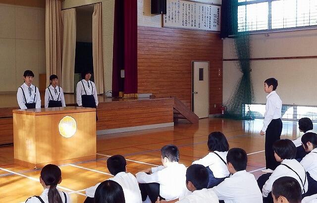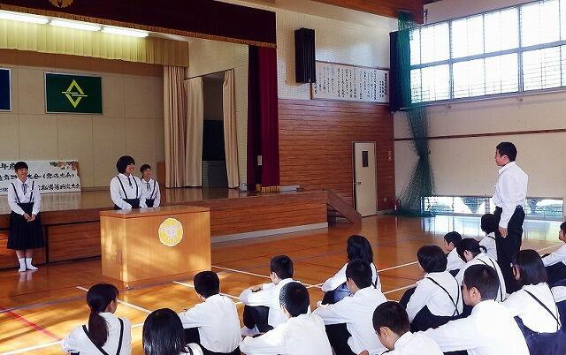 今日は,全校集会でスピーチ活動・西臼杵地区秋季体育大会表彰・西臼杵地区総合体育大会駅伝競技の選手推戴式を行いました。