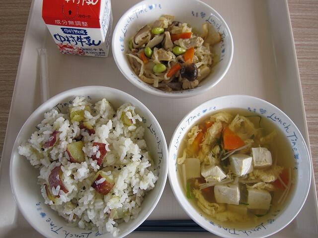 今日は、さつまいもごはんにかきたま汁、千切り大根の炒め煮でした。おいしくいただきました。