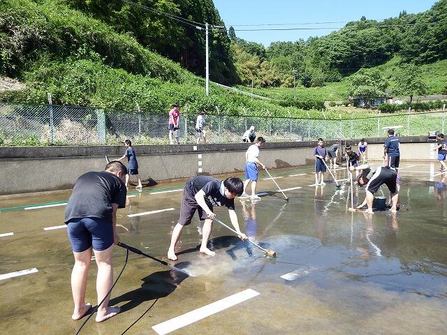 今日は,昨日の雨がうそのように晴れ渡り,晴天の中,プール清掃が行われました。今年は,阿蘇山の噴火の影響で,プールの底には多くの火山灰がたまっており,大変でしたが,みんなで協力してきれいにすることができました。