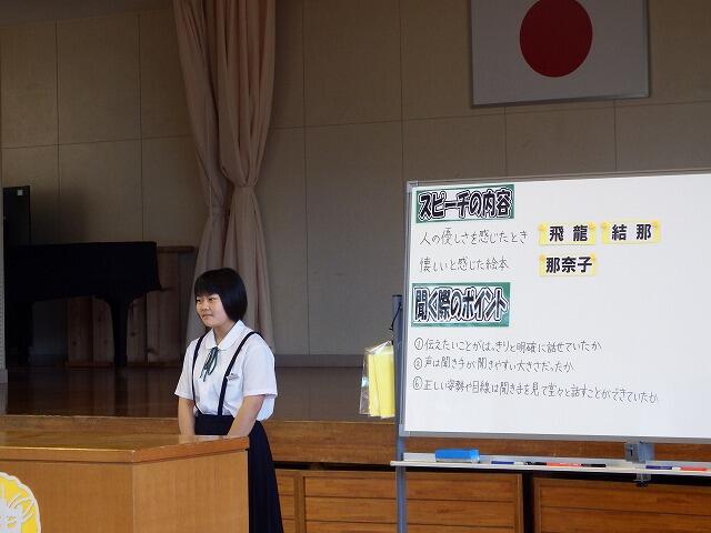 本日の全校集会は,スピーチ活動でした。3人の生徒が,「人の優しさを感じた経験」,「懐かしいあの絵本」というテーマで意見を述べてくれました。