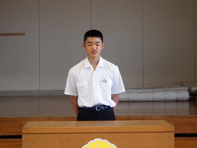 本日の全校集会は,明日から始まる第66回西臼杵地区中学校総合体育大会の選手推戴式でした。各部のキャプテンから意気込みと支えてくださった方々への感謝が述べられ,最後の大会に臨む3年生の思いが伝わってきました。みなさんの健闘を祈ります。