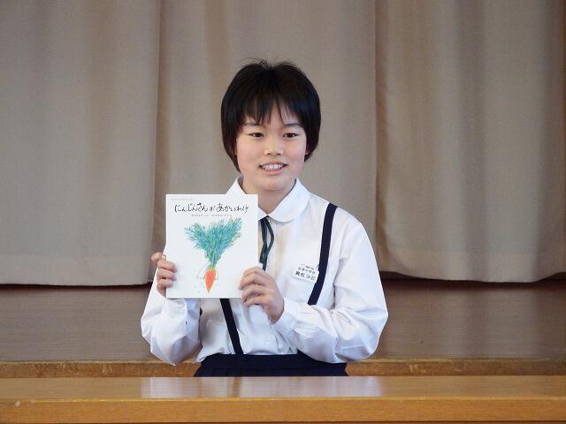 幼い頃に読んでもらった『にんじんさんがあかいわけ』という絵本を紹介してくれました。にんじんは熱いお風呂に頑張って入ったから赤くなり,大根はぬるいお風呂にゆっくりのんびりつかったから白くなったという話を表情豊かに述べてくれました。