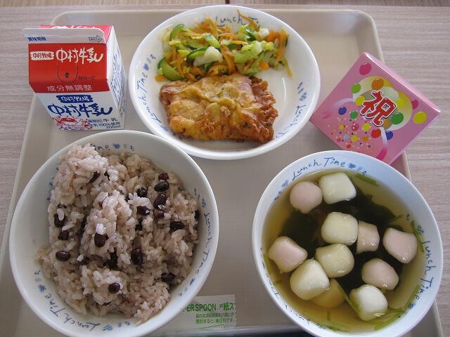今日は、赤飯、お吸い物、魚のチーズフライ、お祝いデザートでした。おいしくいただきました。