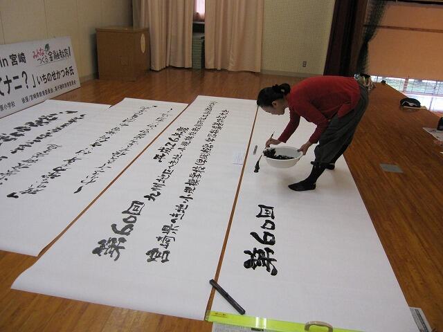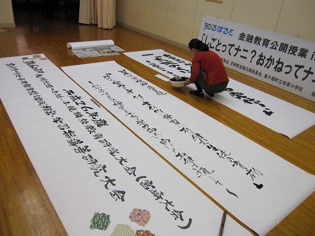 今日は、九州へき地研究会に向けて、書道の先生(プロ)に来ていただいて、看板を作成していただいてます。