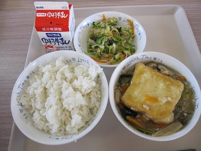 今日は、揚げ豆腐のあんかけにごまジャコサラダでした。おいしくいただきました。