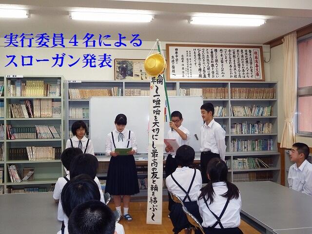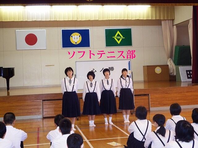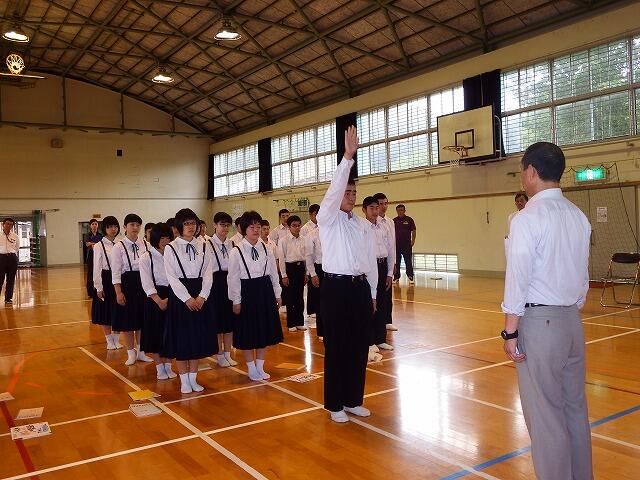 本日の全校集会は,明日から始まる第66回西臼杵地区中学校総合体育大会の選手推戴式でした。各部のキャプテンから意気込みと支えてくださった方々への感謝が述べられ,最後の大会に臨む3年生の思いが伝わってきました。みなさんの健闘を祈ります。