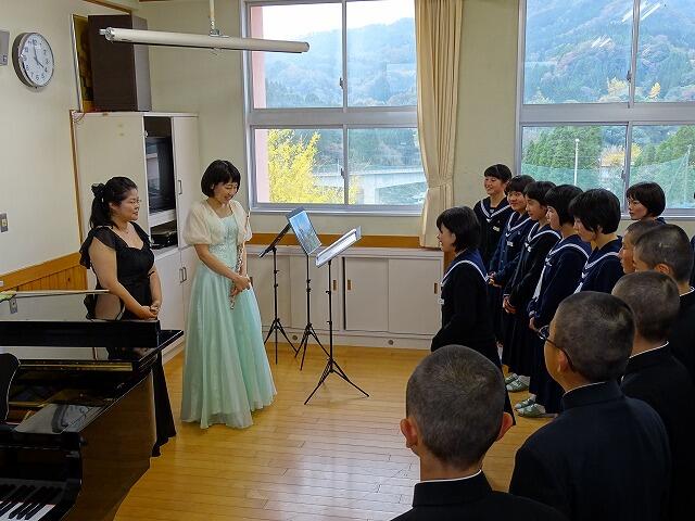 6時間目に、宮崎県立劇場が主催する「音楽アウトリーチ」が開催されました。「音楽アウトリーチ」とは、劇場を飛び出した若い演奏家が3つのS「小スペース・少人数・短い時間」で、大ホールでは味わうことのできない「身近に感じる音楽」を届ける事業です。今日は、フルート奏者の熊谷愛香さん、ピアニストの野﨑さやかさんに演奏していただき、心癒される時間となりました。チケットも準備していただき、コンサートの雰囲気を味わうことができました。