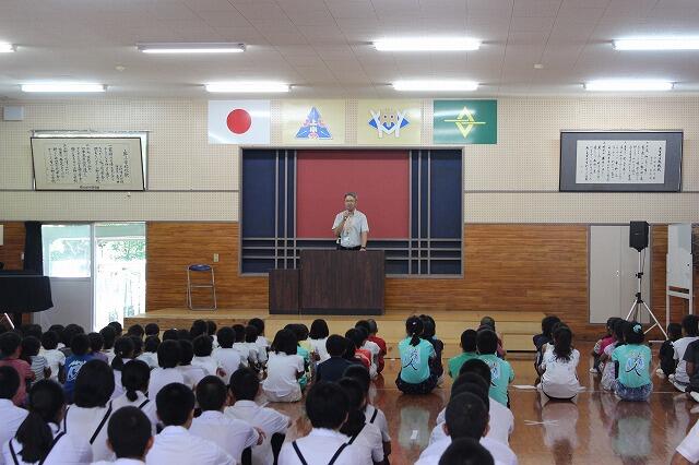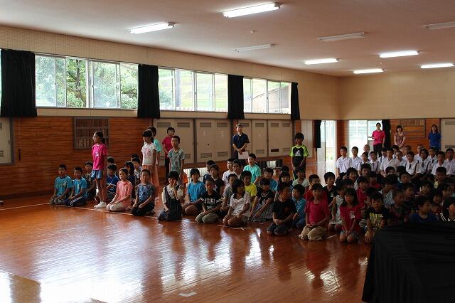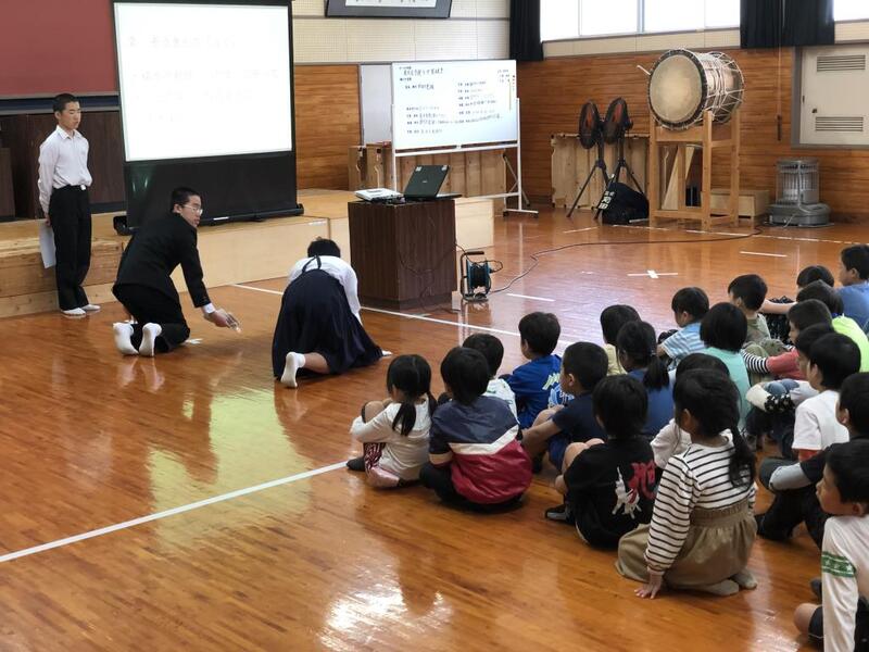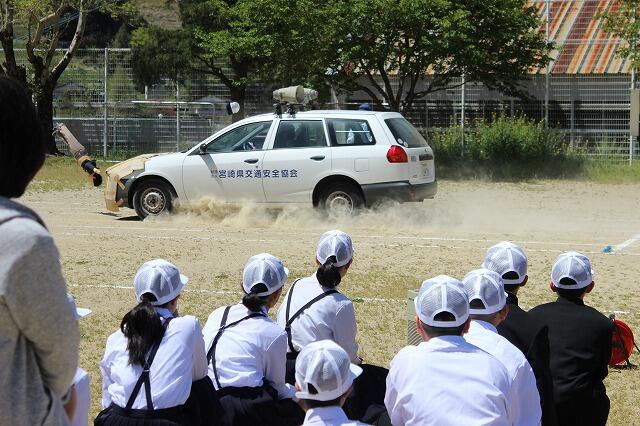 全校児童生徒向けに交通安全教室が行われました。最初に、高千穂町交通安全協会の職員の方と上野駐在所の上米良さんから車の危険性についての話と実演をしていただきました。