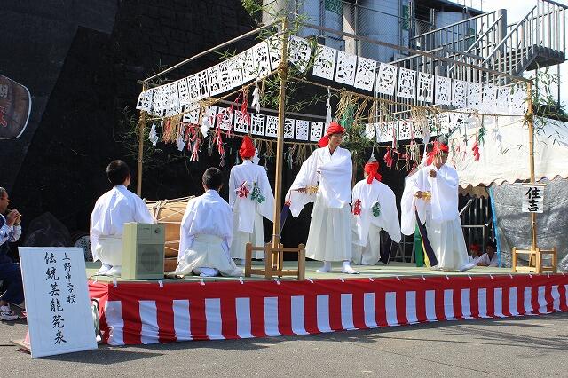 10月10日(土)に上野中学校の文化祭が行われました。午前中は、日本語弁論、英語暗唱弁論、1学年発表「上野の現状を学ぼう」2学年発表「スキット劇~Let's go on a school trip !~」3学年発表「劇 もう一人のピノキオ」、全体合唱・合奏が行われました。午後は、総合的な学習の時間などに練習を重ねた伝統芸能の発表が行われました。1,2年生は「上野臼太鼓踊り」、3年生は「神楽」を発表しました。準備や練習時間の少ない中、全校生徒で一致団結し、素晴らしい文化祭にすることができました。