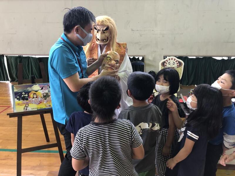 子どもたちは、興味津々。大きな昆虫の模型や神楽の面などに目を輝かせていました。