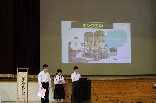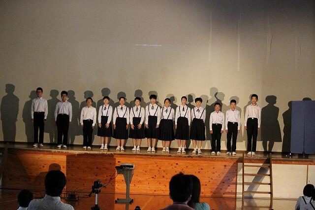 10月12日(土)に文化祭が行われました。午前中には、国語弁論、英語暗唱・弁論、各学年の発表、合唱がありました。各学年の発表は、1年生が職場訪問学習の発表、2年生が修学旅行の発表、3年生が劇「グッバイ・マイ」を発表しました。どの学年の発表も時間をかけて作り上げた素晴らしい内容でした。午後には、伝統芸能披露が行われました。1,2年生は上野臼太鼓踊り、3年生は神楽を披露しました。どちらも夏休みから、師匠の指導を受け、練習を積み重ねてきました。どちらも見応えのある伝統芸能を披露することができました。中学生にとって、充実した1日となりました。