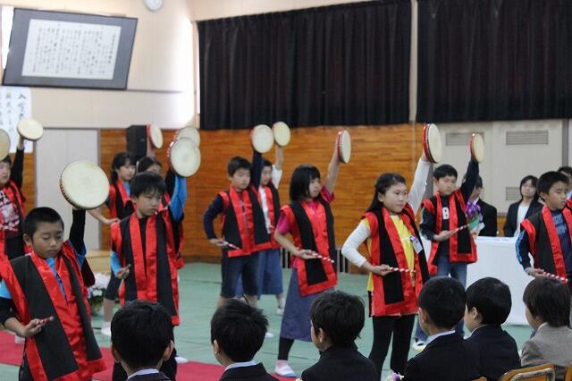 上野小学校伝統のエイサーで歓迎しました。(6年生が演舞)