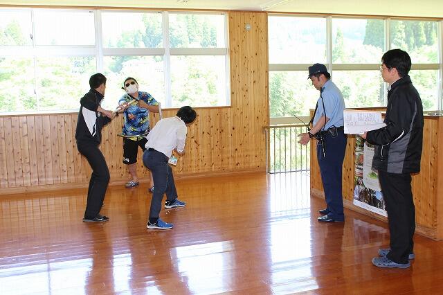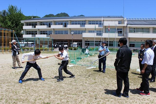 避難訓練の終了後、教員向けに「さすまた」の使い方を警察官に指導していただきました。