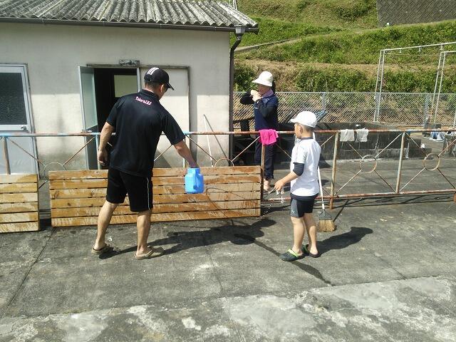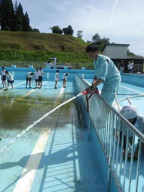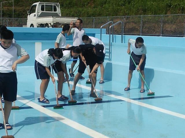 いよいよプールシーズンが始まります。小学校5・6年生と中学校全校生徒でプール清掃を行いました。雲1つない青空の下、みんな一生懸命にプールやプールサイド、更衣室を清掃しました。6月4日(月)がプール開きの予定です。待ち遠しいですね!!