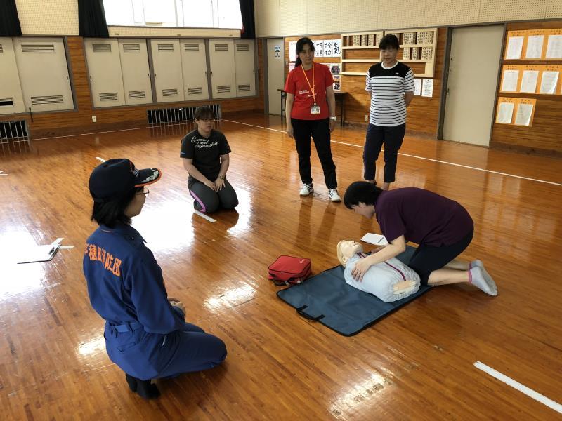 プールの時期を前に、消防署から3名の講師をお招きし、心肺蘇生法の研修を行いました。