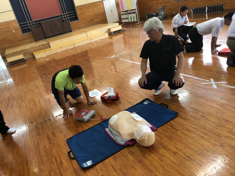 心臓マッサージや人工呼吸法の他に、AEDの使用についても教えていただき、練習を行いました。