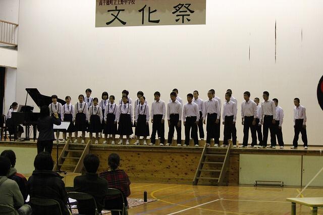 10月10日(土)に上野中学校の文化祭が行われました。午前中は、日本語弁論、英語暗唱弁論、1学年発表「上野の現状を学ぼう」2学年発表「スキット劇~Let's go on a school trip !~」3学年発表「劇 もう一人のピノキオ」、全体合唱・合奏が行われました。午後は、総合的な学習の時間などに練習を重ねた伝統芸能の発表が行われました。1,2年生は「上野臼太鼓踊り」、3年生は「神楽」を発表しました。準備や練習時間の少ない中、全校生徒で一致団結し、素晴らしい文化祭にすることができました。