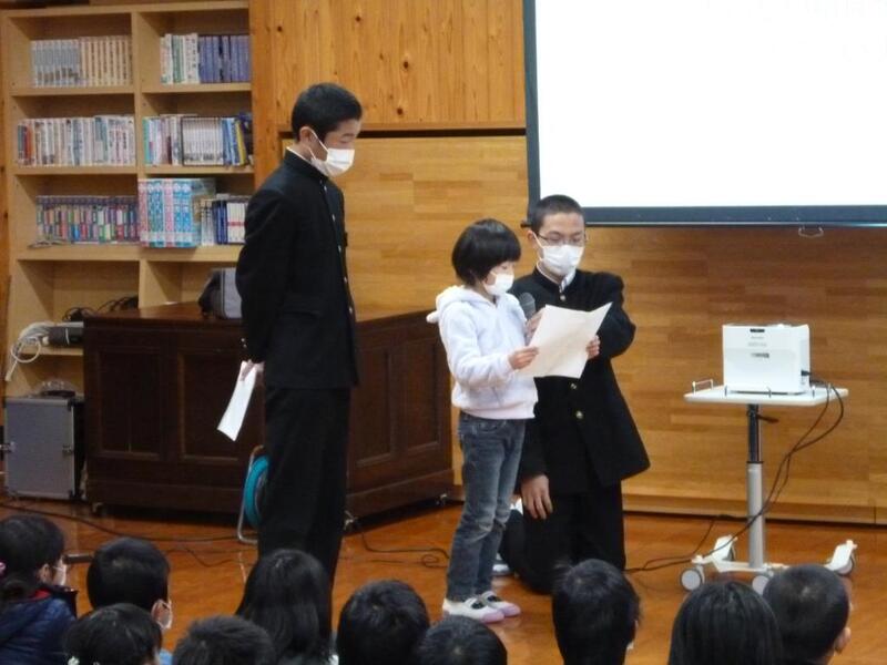 全国学校給食週間を前に、1月23日(木)に給食感謝集会が行われました。集会の中で、児童生徒代表として、小1の城田朋和さんと中1の甲斐友陽さんが調理員さんに感謝の言葉を伝えました。いつもおいしい給食を作ってくださる調理員の甲斐和美さん、陳内和代さん、興梠房子さん、ありがとうございます。