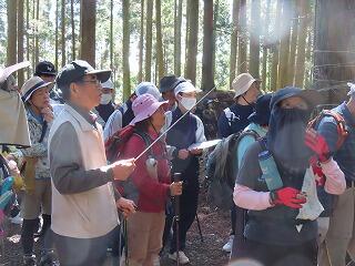 講師の興梠幸男さんから、海を守る山のはたらきと100年のスギを育てることについて説明があり、その後、一般の方々と一緒に見学を始めました。