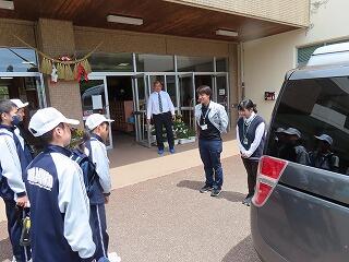送迎をしていただく教育委員会の方にあいさつをして、出発しました。
