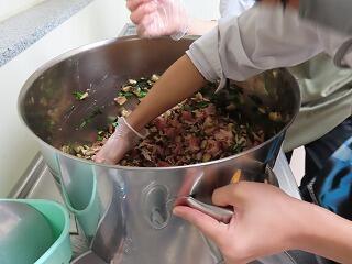 中学3年生が、かっぽ鶏と神楽うどんの下準備をしました。