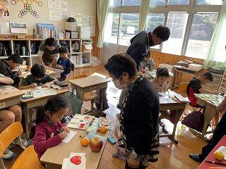 2年生は、算数で三角形や四角形の学習をしました。点をつないで図形を書いたり、仲間分けをしたりしました。教室の掲示板に貼ってある芋掘りの絵も、のびのびとしたタッチで描かれていて、保護者の皆さんも足を止めて見てくださっていました。
