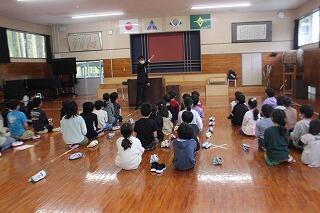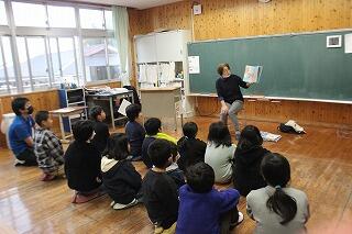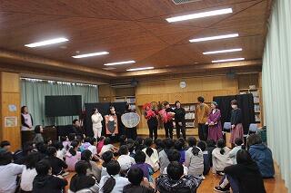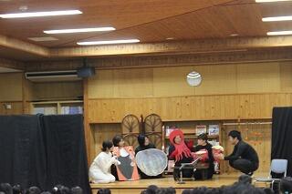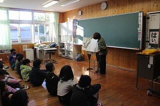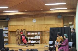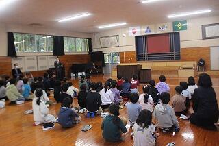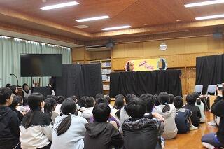 11月16日(木)の2時間目におはなし会がありました。本日は、「おはなしの森」の皆さんと夫婦バンド「ララルー」さんにお越しいただきました。ララルーさんの単独の演奏から始まり、おはなしの森の皆さんの絵本の読み聞かせや芝居を披露してくださいました。最後には、おはなしの森の皆さんとララルーさんとの共演した演劇を、パフォーマンスしていただきました。子どもたちからは、「良い曲・演奏だった」「面白かった」と感想を述べており、感動している様子でした。おはなしの森の皆さん、ララルーさん、お忙しい中ありがとうございました。