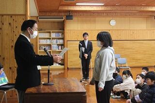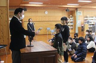 2月14日(水)に令和5年度「地域学校協働活動」推進に係る県教育長表彰の伝達式が本校で行われました。工藤義昭さんは小学3・4年生には棒術の指導、中学1・2年生には臼太鼓踊りの指導をしてくださっています。今回の受賞では、「黒口地区棒術保存会の指導者として、本校児童生徒に伝統継承の大切さなどについて考える機会を提供したとして」地域と学校の協働活動が認められ贈られました。