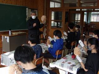 6年生が神楽面彩色体験を実施しました。高千穂町岩戸で「五峰窯」工房をかまえる佐藤和彦様をお招きし、陶芸について最初に講話をして頂きました。