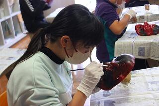 最後に神楽面の目や歯を金色に彩色していきました。金色の彩色は、下地に塗り重ねるため間違えたらやり直しができきません。塗り方のアドバイスを頂きながら、慎重に作業を進めていきました。