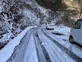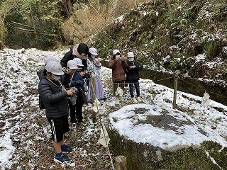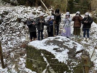 3年生が上野の自然についての現地調査として、校外学習を行いました。竜ヶ岩と四季見原にバスで行く予定でしたが、昨日の寒波の影響で竜ヶ岩までの道が凍結していたため、目的地を急遽変更し、鬼切石と尾橋渓谷に行くことになりました。道中は積雪や路面が凍っており、滑りそうだったので、ゆっくり歩いて行きました。