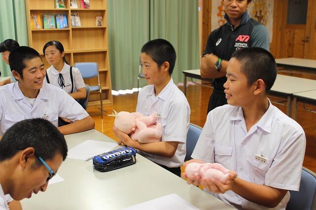 中学校では、7月の「いのちの教育週間」にあわせて、か母ちゃっ子クラブの講師の助産師さんをお呼びして、いのちの誕生について学習をしました。生命の誕生をイラストや実際の赤ちゃんの体重の人形を用いて学びました。命の誕生って素敵ですね!