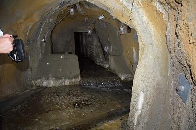 所々に見える照明は使われていないので、手持ちのライトだけでここまで進んできました。足下と天井の突起に気をつけながらの見学でした。