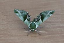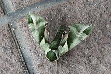 4月28日(木)の朝、いつものように子どもたちが登校してくると玄関に枯れ葉が・・・と思ってよく見ると緑色の羽がある蝶のような昆虫でした。その昆虫を写真に撮り、調べてみるとカレハガ科の「キョクトウスズメ」という蛾(が)でした。登校した子どもたちも興味深そうに見ていました。